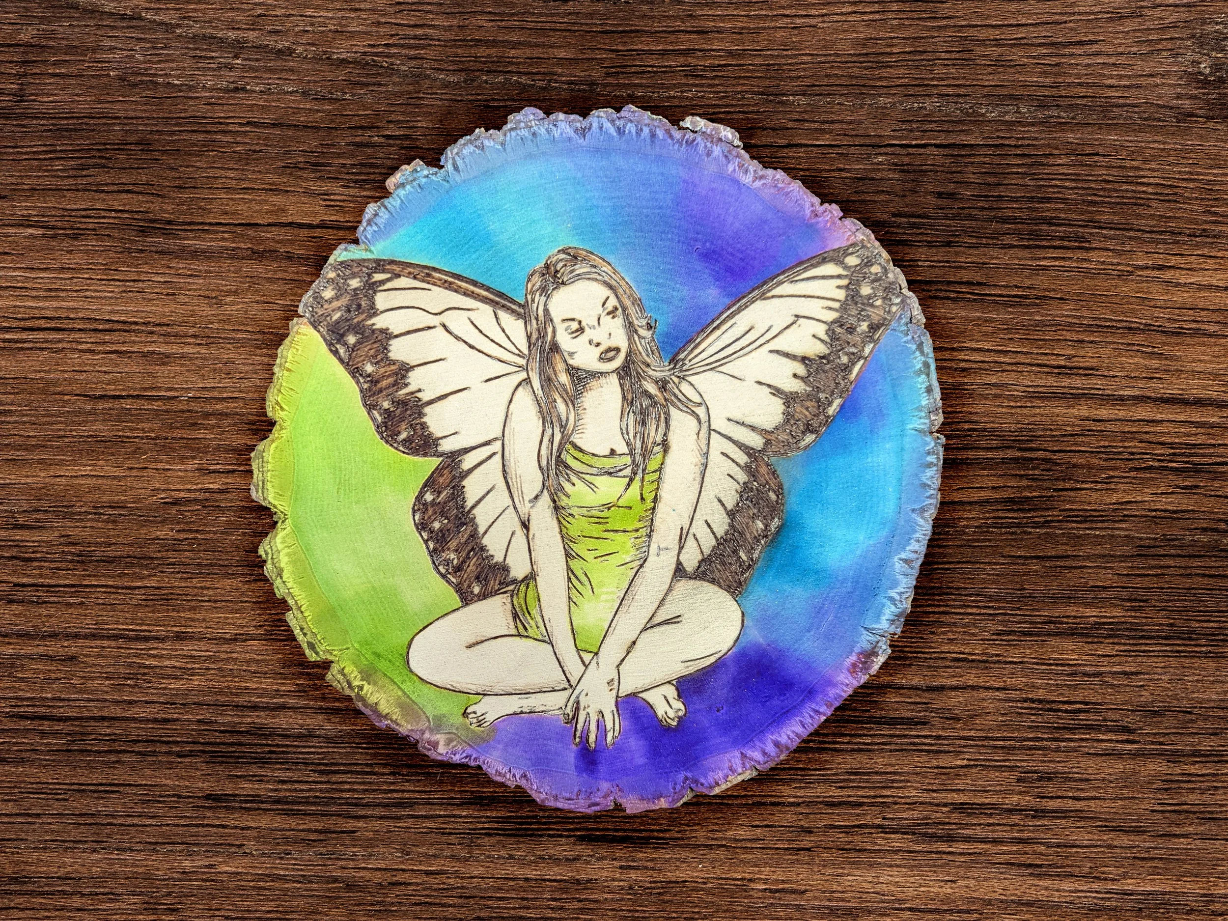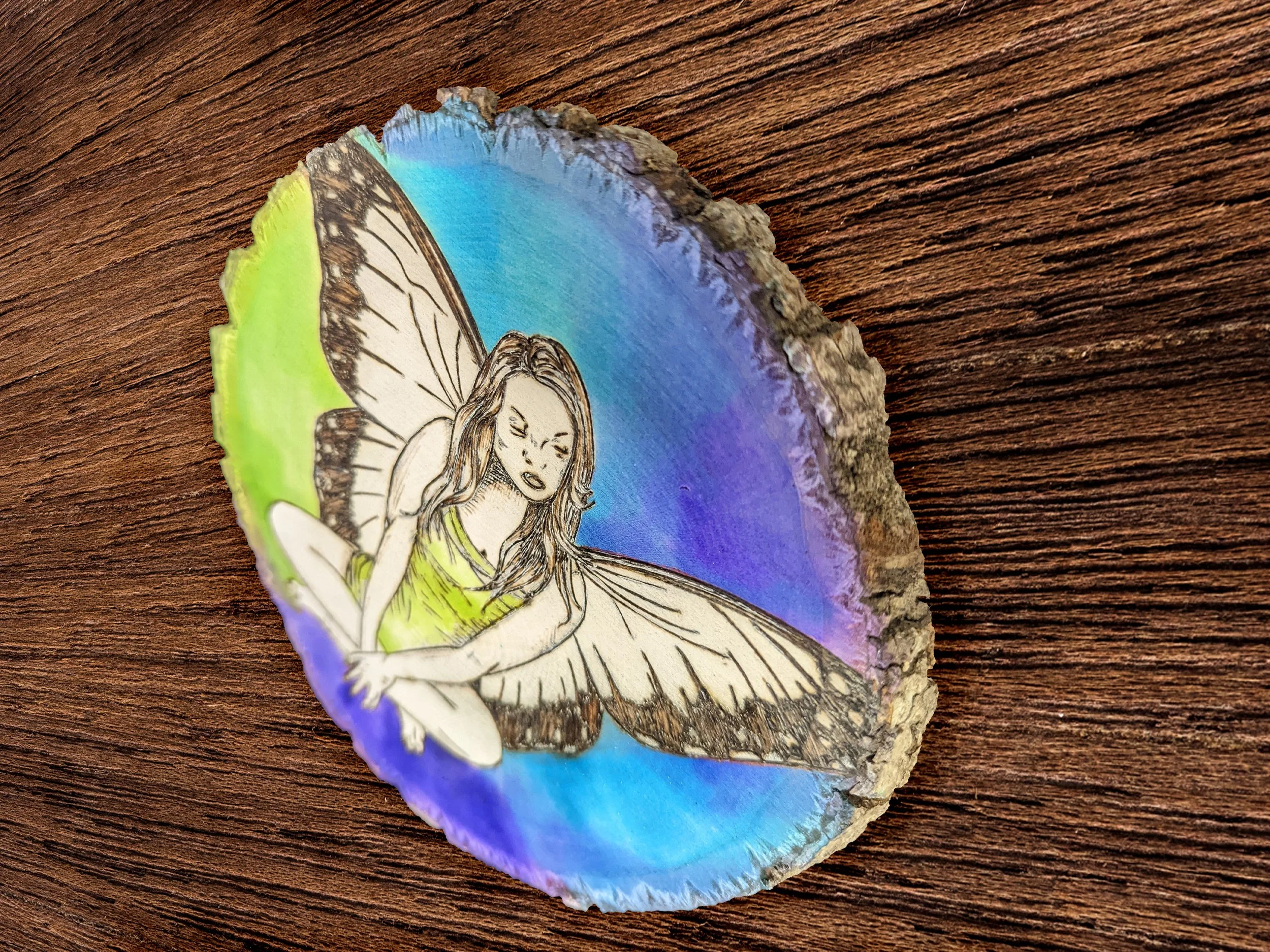 Serene Fairy Pyrography and watercolor on Live Edged RoundSoldThis pensive little fae embodies a calm and slightly mournful mood. The colorful background frames her in its soft light, comforting and offering hope through beauty. View fullsize View fullsize View fullsize View fullsize